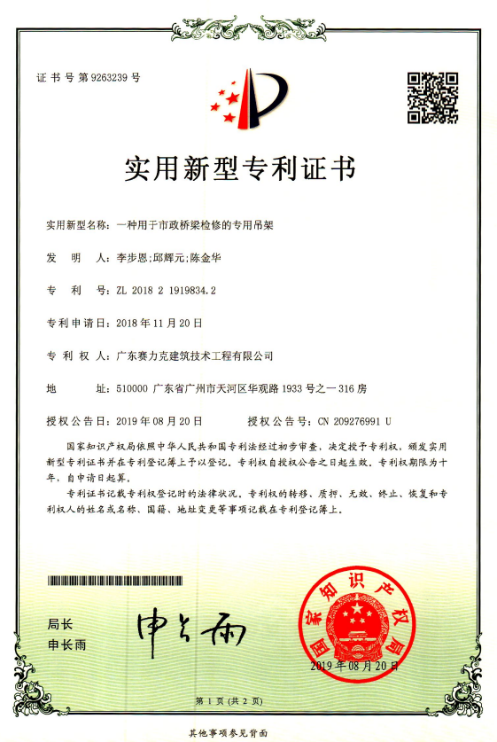 浏览量:1701 发布时间:2019.12.07由广东赛力克建筑技术工程有限公司研发团队研发的“一种用于市政桥梁检修的专用吊架”于2019年8月20日获中华人民共和国国家知识产权局授予实用新型专利证书。专利号:ZL 2018 2 1919834.2。