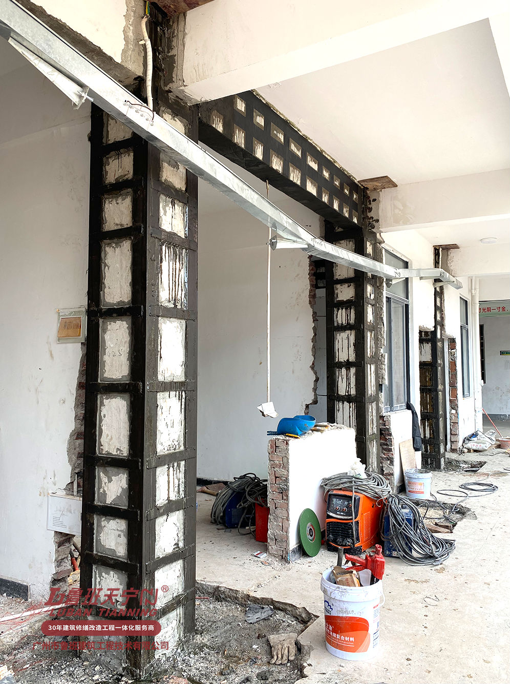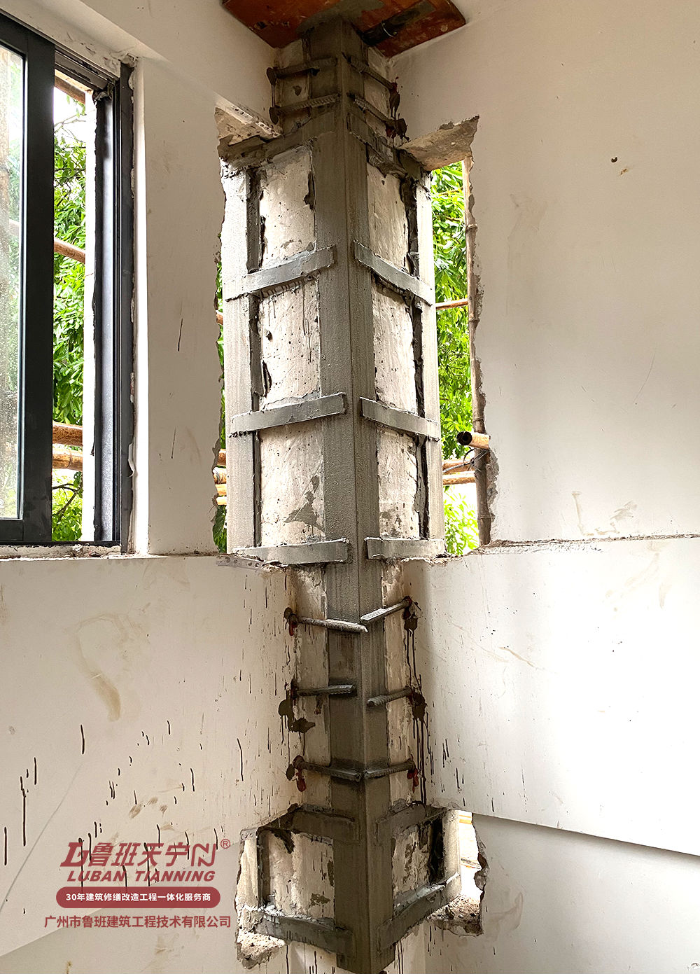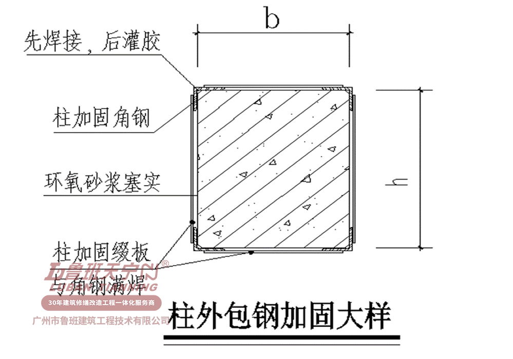 柱外包钢加固法是在柱两角或四角外包型钢或角钢的一种加固方法。在混凝土构件表面与外包钢缝隙间灌注高强水泥砂浆或环氧树脂浆料,同时利用横向缀板或套箍作为连接件,通过高性能配套粘结材料使其两者共同作用受力,以提高构件的承载能力及整体受力性能。